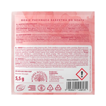 Sposób użycia: Zdejmij foliową torebkę i za pomocą taśmy dwustronnej przymocuj saszetkę w wybranym miejscu. Saszetki doskonale nadają się do szafy, szuflady, komody jak i na półki z pościelą.