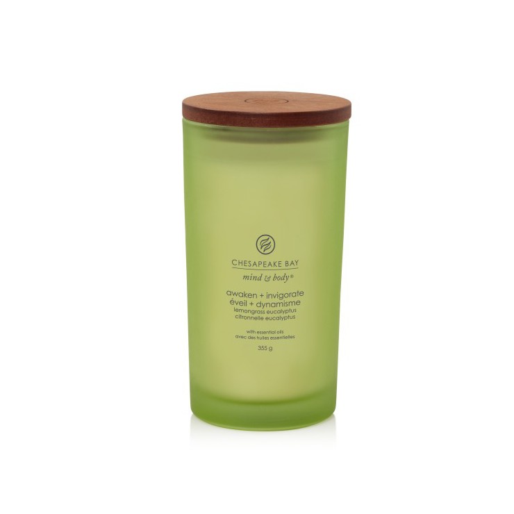 Duża świeca Awaken & Invigorate (Lemongrass Eucalyptus) Chesapeake Bay Candle. Rozbudź zmysły energetyzującym aromatem trawy cytrynowej i werbeny w połączeniu z zapachem orzeźwiających liści eukaliptusa, lawendy i mięty ogrodowej.