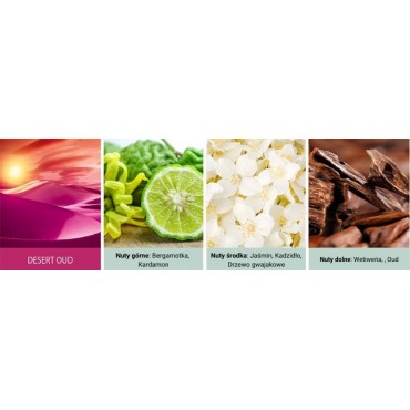 Żywy zapach śródziemnomorskiej cytrusowej pomarańczy i pikantnego kardamonu. W połączeniu z ziemistym oudem, wetiwerią i kojącym drewnem cedrowym Desert Oud to dymny i egzotyczny zapach bogaty w drzewo gwajakowe, kadzidło i jaśmin.