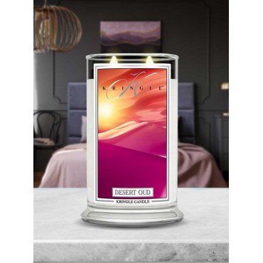 Duża świeca Desert Oud Kringle Candle. Żywy zapach śródziemnomorskiej cytrusowej pomarańczy i pikantnego kardamonu. W połączeniu z ziemistym oudem, wetiwerią i kojącym drewnem cedrowym Desert Oud to dymny i egzotyczny zapach bogaty w drzewo gwajakowe, kadzidło i jaśmin.