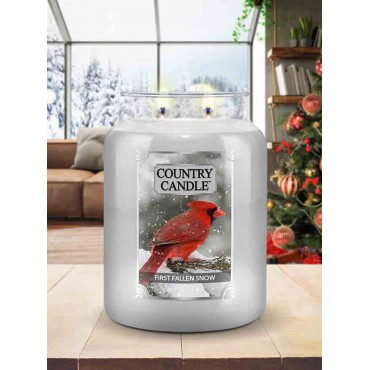 Duża świeca First Fallen Snow Country Candle. First Fallen Snow to intensywna mieszanka jagód, owoców cytrusowych i liści goździków. Świeżo wycięty laur doskonale dopełnia niuanse zimowej mięty i mrożonych malin. Magiczny zapach świeżego śniegu jest optymalnie inscenizowany przez delikatne aromaty świerku i wanilii.