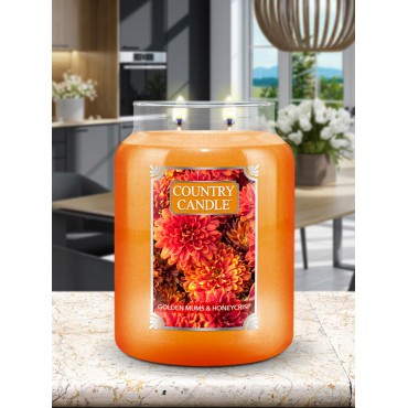 Duża świeca Golden Mums & Honeycrisp Country Candle. Golden Mums & Honeycrisp to połączenie przypraw korzennych i pomarańczy przełamane chrupkim i soczystym jabłkiem Honeycrisp wraz z zapachem bujnie kwitnących chryzantem przypomina nam o schyłku lata podczas ciepłych, promiennych dni nadchodzącej jesieni.