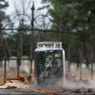 Duża świeca Haunted Mansion Village Candle. Nawiedzony dom położony wysoko na wzgórzu jest ciemny i pusty, gdy kłęby dymu i mgły tajemniczo mieszają się. Skuszone słodyczą ciemnych jagód i ciepłymi nutami paczuli wypełniają powietrze zapraszając na wieczorny strach.
