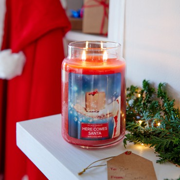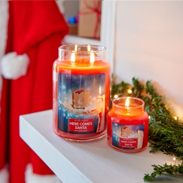 Duża świeca Here Comes Santa Village Candle. Och, jak fajnie jest świętować tę świąteczną porę roku! Gałęzie świeżego cyprysu zdobią palenisko, a przyprawy i drzewo cedrowe wprowadzają poczucie przytulnych i jasnych dekoracji, które rozpalą Twoje ulubione wspomnienia z dzieciństwa. Domy są przepełnione miłością i młodzieńczą radością, ponieważ świąteczne ciasteczka z przyprawami są przygotowywane w oczekiwaniu na wizytę Świętego Mikołaja.