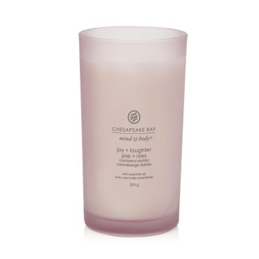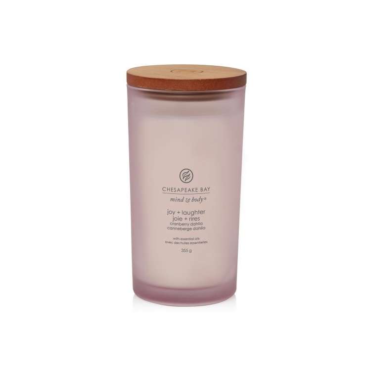 Duża świeca Joy & Laughter (Cranberry Dahlia) Chesapeake Bay Candle. Owocowy bukiet złożony z aromatu suszonej żurawiny, nektaru śliwkowego i kwitnącej dalii dopełniony wyrazistym zapachem mahoniu.