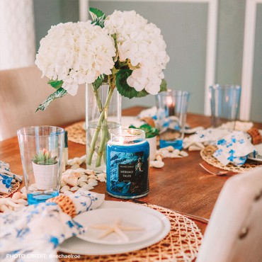 Duża świeca Mermaid Tales Village Candle. Morza jest tajemniczym tłem dla pływających w nim syren. Mistyczna istota morska, która posiada piękno i magiczną moc. Podobnie jak wróżki, każda syrena rzuca magicznymi czarami. Syreny zadziwiają wodnymi nutami, tańcząc w morzu delikatnymi ruchami, zbierając maleńkie skarby zakazanych jabłek. Płynąc przez słoną morską wodę i zroszone zielenie, dzień zamienia się w noc i zaprasza wszystkie stworzenia do tego wspaniałego tańca wśród błyszczących syren bogini i labiryntu koralowców.