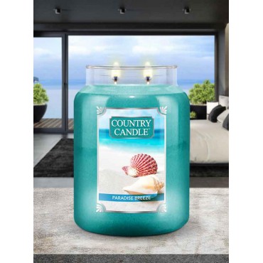 Duża świeca Paradise Breeze Country Candle. Wyobraź sobie tropikalny wypoczynek z bujnymi zielonymi liśćmi palm, świeżym bananem i wodą kokosową. Paradise Breeze dostarcza kwitnących kwiatów połączonych z bogatą fasolą tonka i słodkim cukrem waniliowym w tym wyjątkowym zapachu, inspirowanym morzem.
