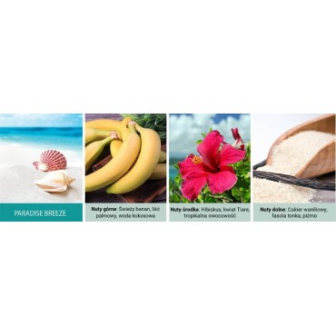 Wyobraź sobie tropikalny wypoczynek z bujnymi zielonymi liśćmi palm, świeżym bananem i wodą kokosową. Paradise Breeze dostarcza kwitnących kwiatów połączonych z bogatą fasolą tonka i słodkim cukrem waniliowym w tym wyjątkowym zapachu, inspirowanym morzem.