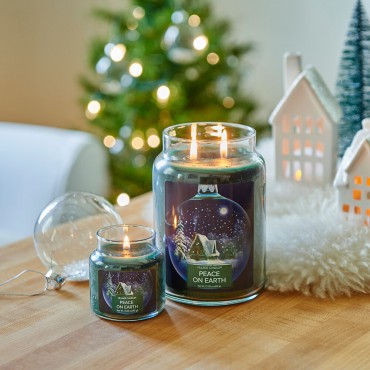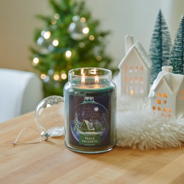 Duża świeca Peace on Earth Village Candle. Gdy miękkie opady śniegu pokrywają ziemię puszystą białą osłoną, świat zaczyna się wyciszać, gdy wdychasz rześki, przepełniony sosnami zapach zimowego powietrza. Ucieknij do swojego zimowego domku, gdzie płonie kominek, a sosna jest zmiękczona nutami soli morskiej i drewna brzozowego. W tej chwili wszystko jest w idealnym spokoju.