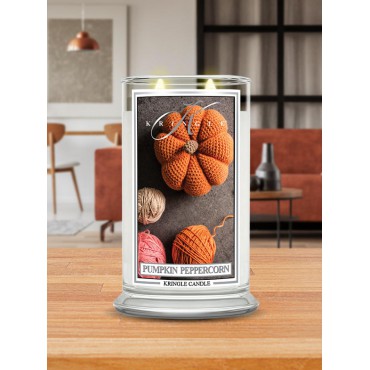 Duża świeca Pumpkin Peppercorn Kringle Candle. Pumpkin Peppercorn to pikantne połączenie tradycyjnego zapachu dyni z aromatycznym pieprzem, korzeniem imbiru i liśćmi cassia. Zapach złagodzony słodkim jabłkiem, puree z dyni i słodka wanilią z karmelem.