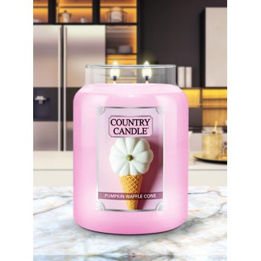 Duża świeca Pumpkin Waffle Cone Country Candle. Pumpkin Waffle Cone jest pełen dyni, piernika i chrupiącego jabłka. Udekorowany słodkim kremem i korzenną słodyczą tworzy wyjątkową kombinację.