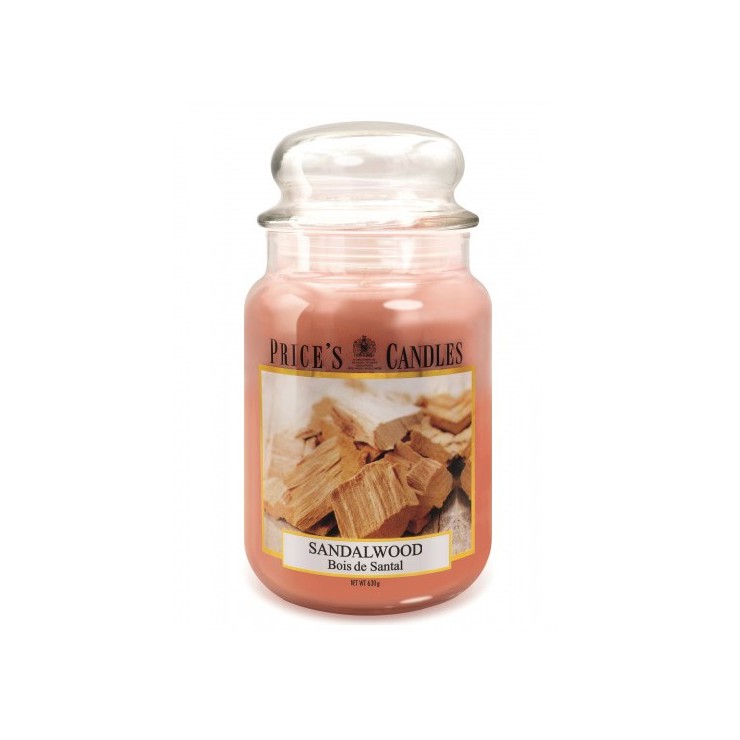 Duża świeca Sandalwood Price's Candles. Jest to bogata, rozgrzewająca świeca w aromatach drzewnych, łącząca klasyczną orientalną bazę z piżmowymi, ciepłymi nutami, tworząc relaksującą, elegancką atmosferę.