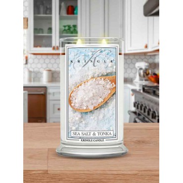 Duża świeca Sea Salt & Tonka Kringle Candle. Ucieknij na molo i poczuj delikatną morską bryzę, słone powietrze i unoszące się nuty cytrusów, bobu tonka, lawendy i jaśminu. Sea Salt & Tonka to mocny morski zapach z kojącym bursztynem, cedrem i piżmem.