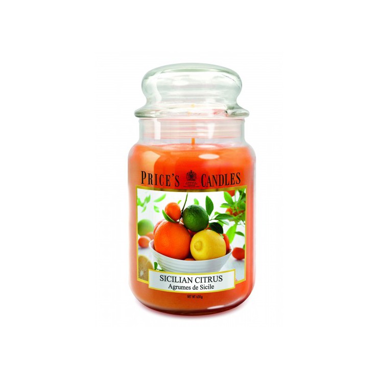 Duża świeca Sicilian Citrus Price's Candles. Ucieknij nad Morze Śródziemne z tym kuszącym zapachem. Słoneczna mieszanka soczystych pomarańczy, soczystych cytryn i limonek tworzy ciepły i orzeźwiający aromat, który z pewnością sprawi, że każdy dzień będzie przypominał lato.