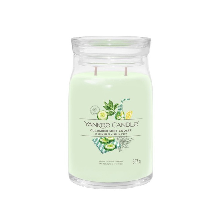 Duża świeca Signature Cucumber Mint Cooler Yankee Candle. Poczuj zapach orzeźwiającego i aromatycznego napoju na bazie ogórka, cytryny i mięty.