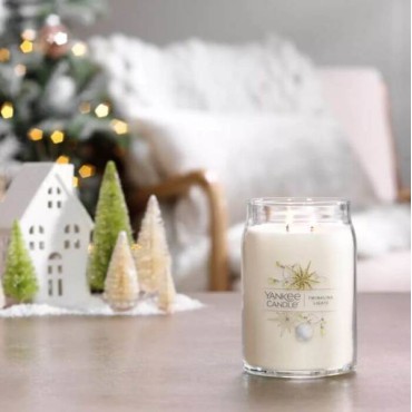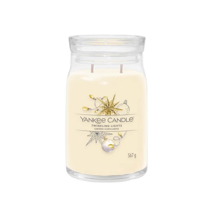 Duża świeca Signature Twinkling Lights Yankee Candle. Aromatyczna mieszanka migdałów i jaśminu połączona z nutami ciepłego bursztynu wprowadzi świąteczny nastrój do Twojego domu.