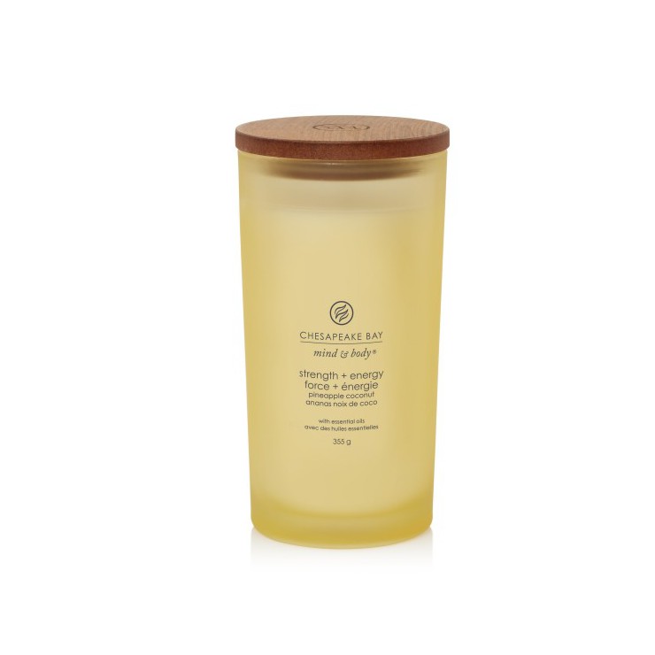Duża świeca Strength & Energy (Pineapple Coconut) Chesapeake Bay Candle. Pobudzająca zmysły owocowa mieszanka aromatów soczystego ananasa, wody kokosowej, soli morskiej i muśniętej słońcem bergamotki.