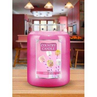 Duża świeca Sweet Stuff Country Candle. Aromatyczny aromat cytrusów, róży damasceńskiej, jaśminu i kokosa, ciepły bursztyn, drzewo sandałowe i fasolka tonka dodają delikatnej, słodkiej kwiatowej esencji Sweet Stuff.