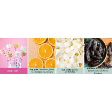 Aromatyczny aromat cytrusów, róży damasceńskiej, jaśminu i kokosa, ciepły bursztyn, drzewo sandałowe i fasolka tonka dodają delikatnej, słodkiej kwiatowej esencji Sweet Stuff.