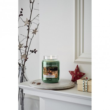 Duża świeca Tree Farm Festival Yankee Candle. Poddaj się magii świąt wraz z najbliższymi i przenieś się do serca jarmarku Bożonarodzeniowego, który kusi zapachem sosny, wetywerii i gardenii.