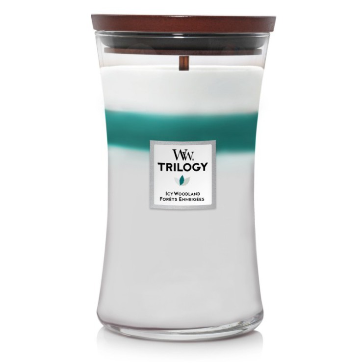 Duża Świeca Trilogy Icy Woodland WoodWick Seria Trilogy łączy ze sobą aż trzy klasyczne zapachy w jednej świecy. Idealnie dobrane kompozycje przeplatają się ze sobą tworząc nowy wyjątkowy zapach! Icy Woodland- jest jak mroźny spacer po lesie w którym aromaty owoców jałowca przeplatają się z aromatem kwiatów magnolii i lawendy.