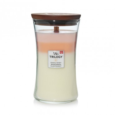 Duża Świeca Trilogy Island Getaway WoodWick to trzy warstwy koloru i aromatu połączono, aby stworzyć jedną piękną świecę. Każda z nich posiada unikalną kompozycję wosków, które topiąc się uwalniają wyjątkowy zapach: Coastal Sunset, Island Coconut, Seaside Mimosa.