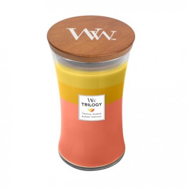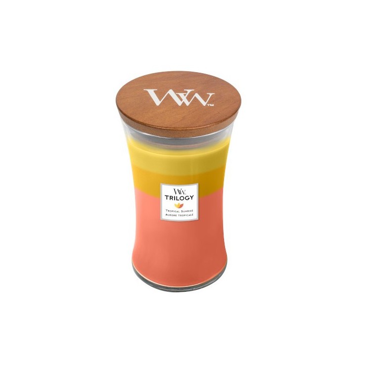 Duża Świeca Trilogy Tropical Sunrise WoodWick to trzy warstwy koloru i aromatu połączono, aby stworzyć jedną piękną świecę. Każda z nich posiada unikalną kompozycję wosków, które topiąc się uwalniają wyjątkowy zapach: Blue Java Banana, Seaside Mimosa i Tamarind & Stonefruit.