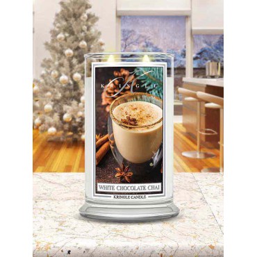 Duża świeca White Chocolate Chai Kringle Candle. Świeca zapachowa White Chocolate Chai marki Kringle Candle to słodki zapach, nie tylko dla smakoszy. Gałka muszkatołowa, goździk i delikatne nuty karmelu stanowią podstawę pysznego zapachu. Spienione mleko, słodka śmietana i nuta cynamonu doskonale dopełniają doznania zapachowe. Daj się oczarować słodkim zapachem popularnego gorącego napoju.