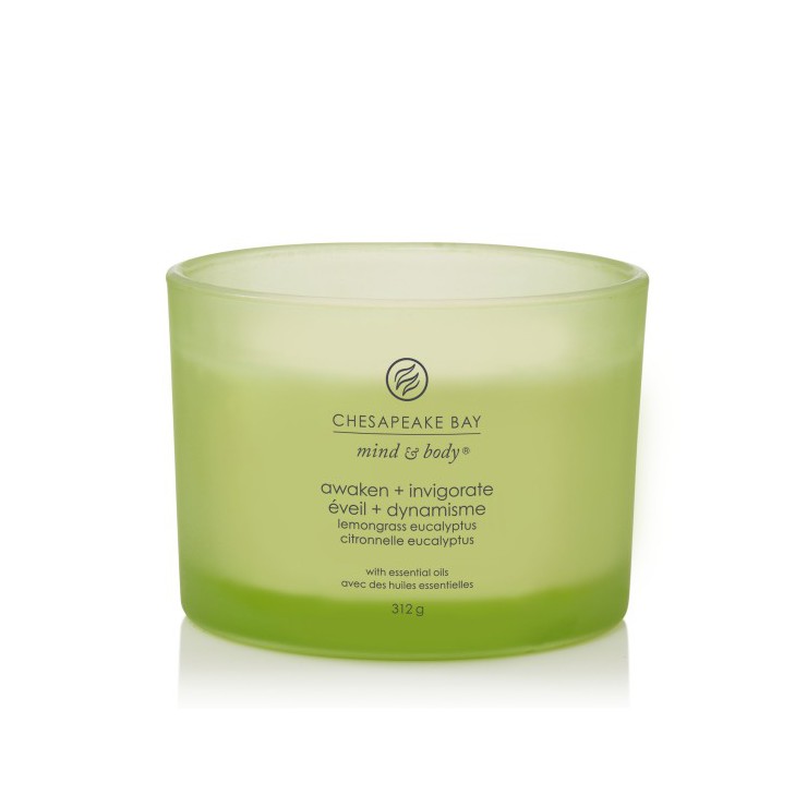 Duża świeca z 3 knotami Awaken & Invigorate (Lemongrass Eucalyptus) Chesapeake Bay Candle. Rozbudź zmysły energetyzującym aromatem trawy cytrynowej i werbeny w połączeniu z zapachem orzeźwiających liści eukaliptusa, lawendy i mięty ogrodowej.