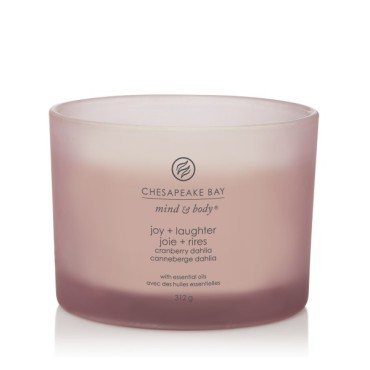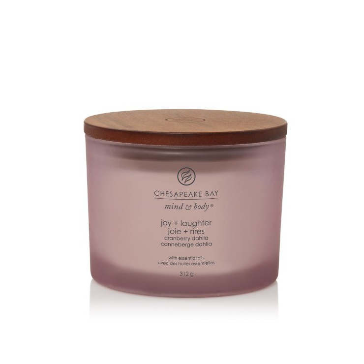 Duża świeca z 3 knotami Joy & Laughter (Cranberry Dahlia) Chesapeake Bay Candle. Owocowy bukiet złożony z aromatu suszonej żurawiny, nektaru śliwkowego i kwitnącej dalii dopełniony wyrazistym zapachem mahoniu.