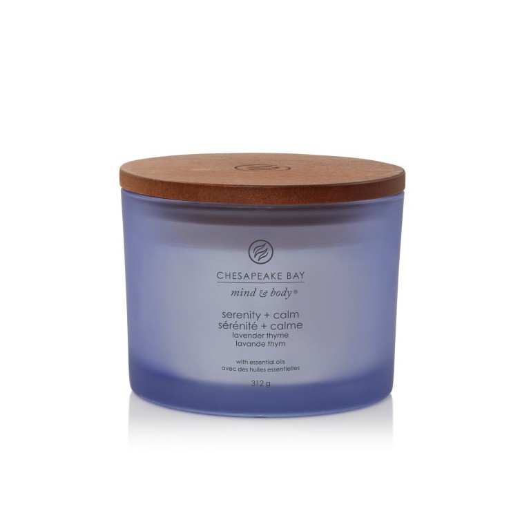 Duża świeca z 3 knotami Serenity & Calm (Lavender Thyme) Chesapeake Bay Candle. Stwórz pogodną i spokojną atmosferę dzięki kojącym aromatom bergamotki, rozmarynu i lawendy w połączeniu z kwiatem pomarańczy, tymiankiem i paczulą.