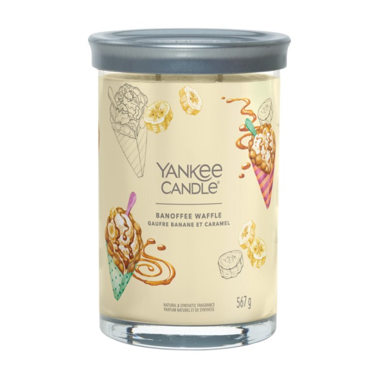 Duży tumbler Signature Banoffee Waffle Yankee Candle. Słodki waniliowy wafelek wypełniony gałką lodów bananowych oblanych karmelem i czekoladą