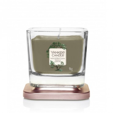 Elevation mała świeca Vetiver & Black Cypress Yankee Candle. Wejdź do chłodnego, zacienionego lasu, w którym trawiaste aromaty wetywerii i drzewa elemi przeplatają się z nutami egzotycznych przypraw i ciepłego bursztynu.