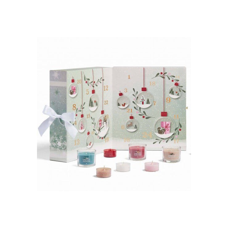 Za drzwiami pudełka znajduje się tealight lub sampler, wszystkie w pięknych, świątecznych zapachach. Zawiera również szklany świecznik na sampler w przezroczyste gwiazdy, świecące się gdy świeca pali się w środku. Kalendarz zawiera świąteczne zapachy z kolekcji Snow Globe Wonderland oraz najlepsze zapachy z poprzednich kolekcji świątecznych. Każdy z tych zapachów jest absolutnie fantastyczny.