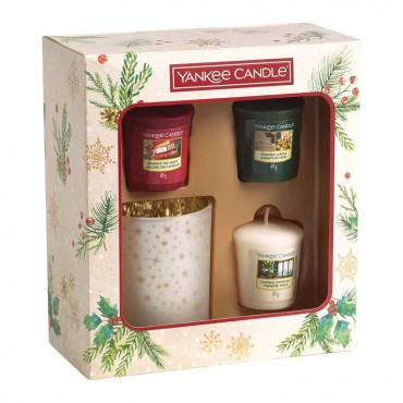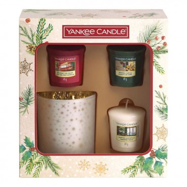 Magical Christmas Morning - zestaw 3 świec typu votive ze świecznikiem Yankee Candle. Wyjątkowy zestaw 3 świątecznych samplerów zapachowych wraz ze świecznikiem, zapakowane w piękne, tekturowe pudełko. Idealny pomysł na prezent. Świąteczne zapachy stworzą miłą atmosferę w trakcie Świąt Bożego Narodzenia i nie tylko.