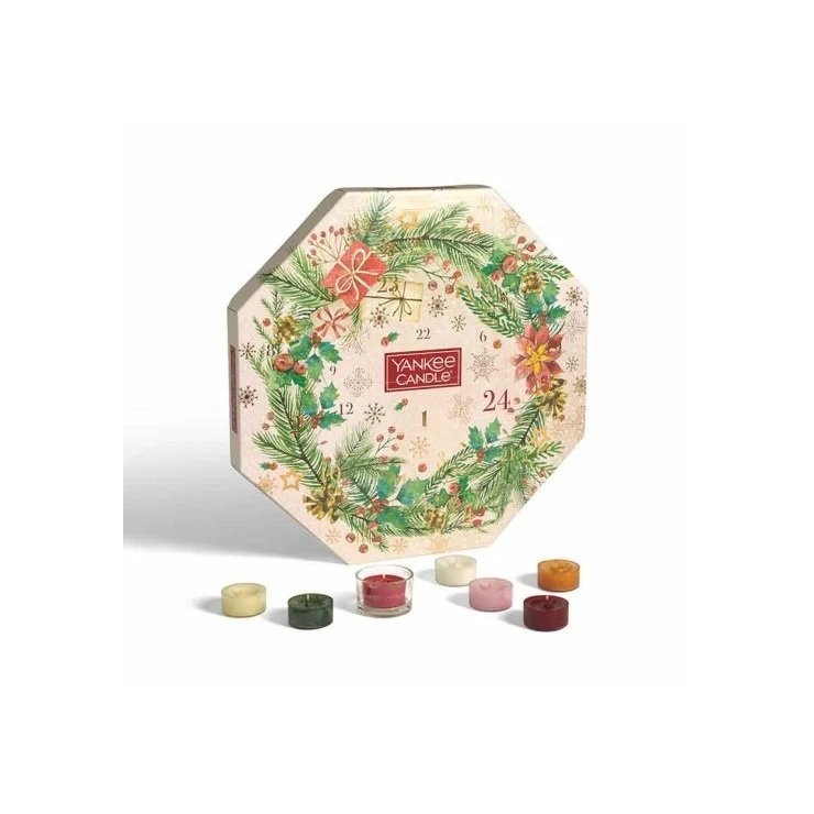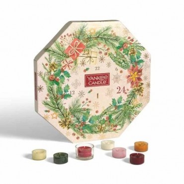 Kalendarz adwentowy Yankee Candle Magical Christmas Morning Advent Calendar w postaci wieńca zawiera 24 podgrzewaczy i 1 świecznik na tealight.