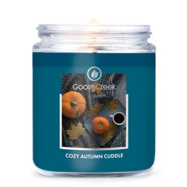 Mała świeca Cozy Autumn Cuddle Goose Creek Candle. Odpocznij z książką w ręku, przykryj się przyjemnym ciepłym kocem. Jest tak przytulnie!