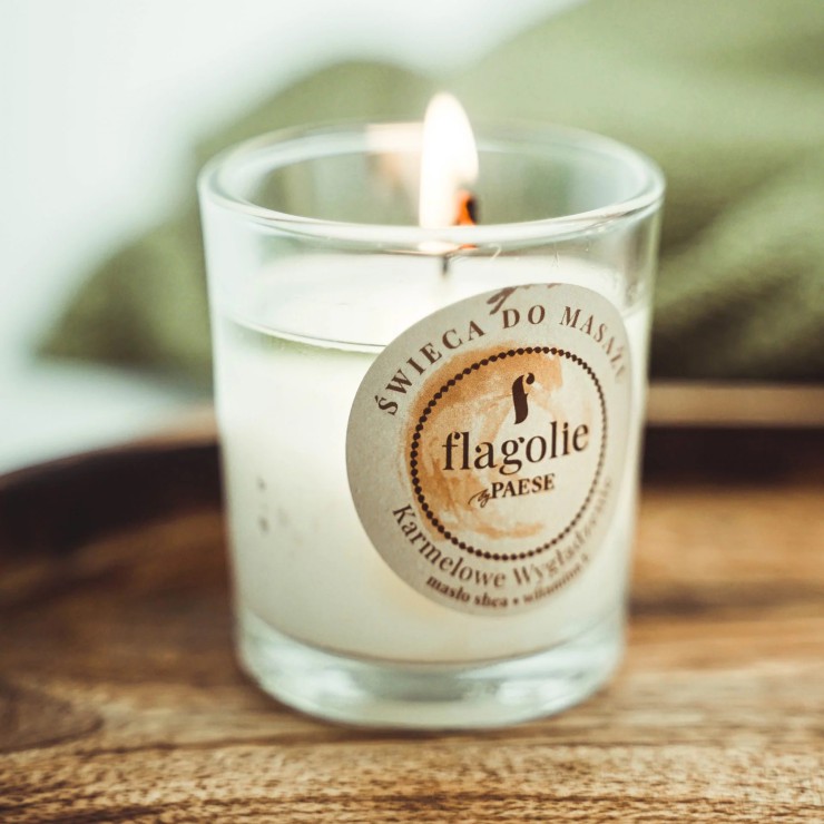 Mała świeca do masażu Karmelowe Wygładzenie Flagolie. Mini odpowiednik naszej świecy do masażu Karmelowe Wygładzenie. W składzie znajdują się całkowicie naturalne składniki, takie jak: masło Shea, masło kakaowe, masło kawowe i wosk sojowy. Mniejsza gramatura i bardziej minimalistyczne wykończenie sprawia, że możesz przetestować zapach i działanie przed zakupem świecy pełnowymiarowej.