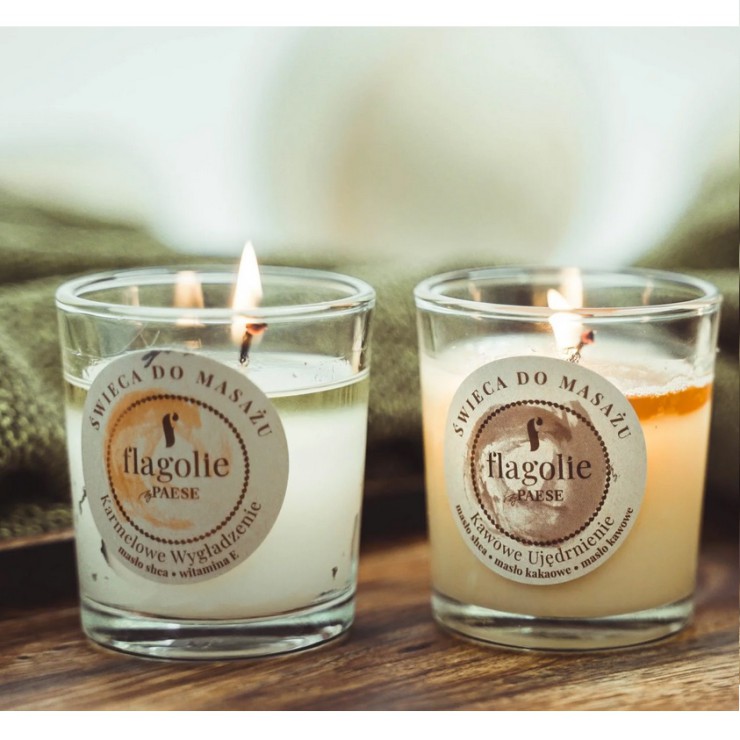 Mała świeca do masażu Kawowe Ujędrnienie Flagolie. Mini odpowiednik naszej świecy do masażu Kawowe Ujędrnienie. W składzie znajdują się całkowicie naturalne składniki, takie jak: masło Shea, masło kakaowe, masło kawowe i wosk sojowy. Mniejsza gramatura i bardziej minimalistyczne wykończenie sprawia, że możesz przetestować zapach i działanie przed zakupem świecy pełnowymiarowej.