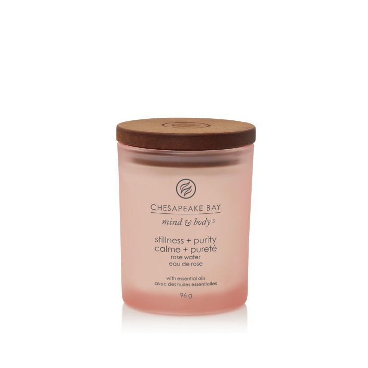 Mała świeca Stillness & Purity (Rose Water) Chesapeake Bay Candle. Delikatny i świeży - kwitnący bukiet róż i piwonii dopełniony zapachem goździków, bursztynu i drzewa agarowego.