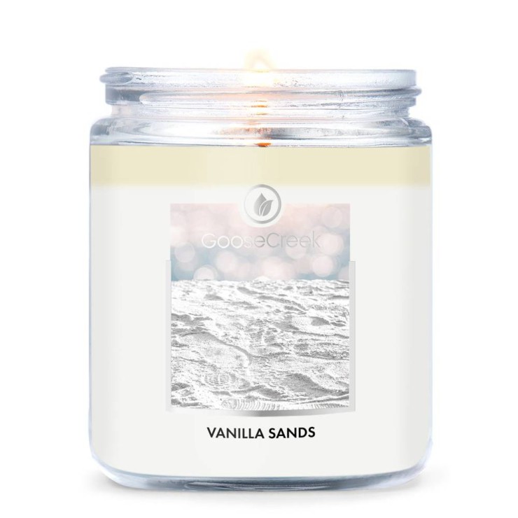 Mała świeca Vanilla Sands Goose Creek Candle. Miękkie kryształki wanilii zrelaksują twoją duszę, gdy woda mieni się o zachodzie słońca.