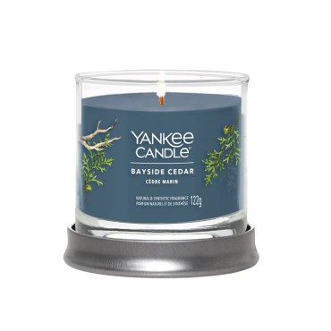 Mały tumbler Signature Bayside Cedar Yankee Candle Spacer leśną ścieżką zaraz po deszczu z orzeźwiającymi nutami grejpfruta, kwiatów mandarynki i ciepłego bursztynu wypełniającego powietrze.