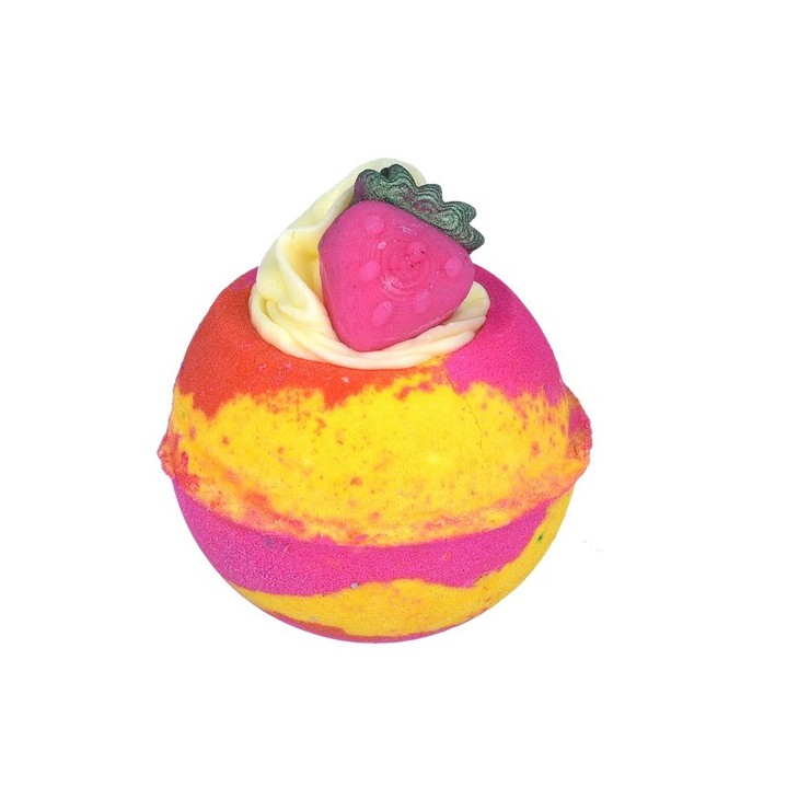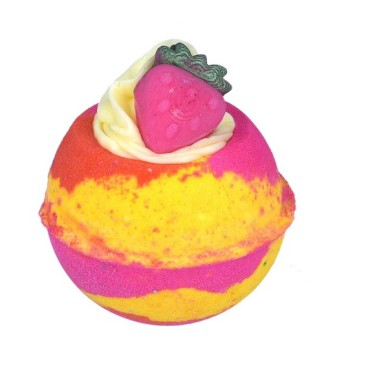 Musująca kula do kąpieli Let's Jam Bomb Cosmetics. Dżem o zapachu słodkich truskawek z czystymi olejkami eterycznymi grejpfruta i mandarynki, podnosi na duchu i ożywia. Zapach przyjazny weganom!