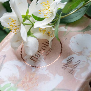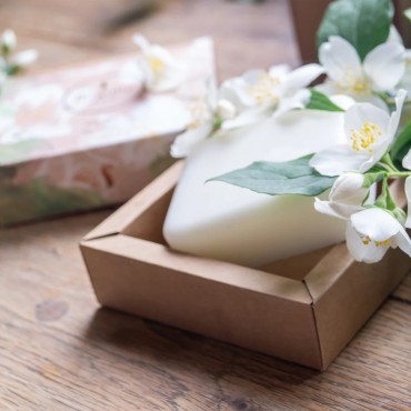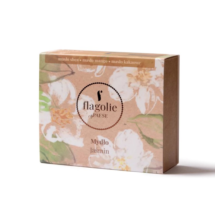 Mydło wegańskie w kostce Jaśmin Flagolie. Mydło o cudownym zapachu jaśminu, oparte na roślinnej bazie, w skład której wchodzą trzy bogate w składniki odżywcze masła: masło shea, mango i masło kakaowe.