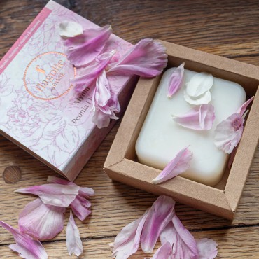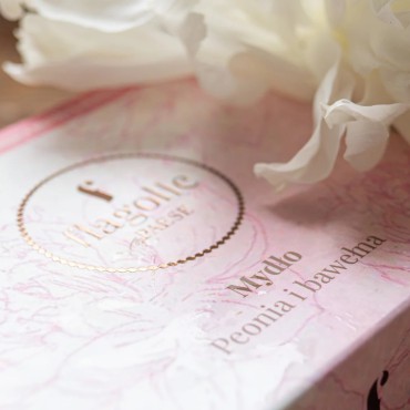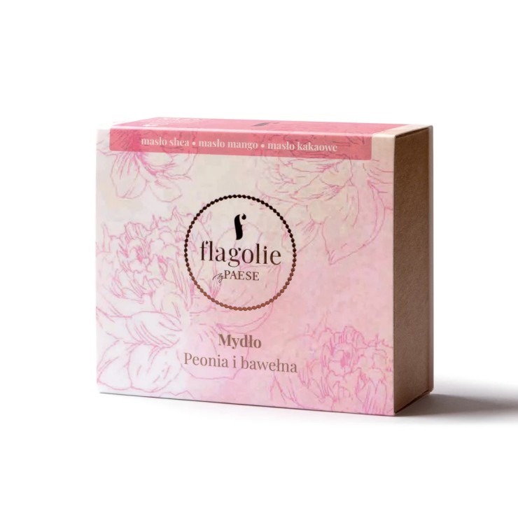 Mydło wegańskie w kostce Peonia i Bawełna Flagolie. Mydło o czarującym zapachy peoni i bawełny, oparliśmy je na roślinnej bazie, w skład której wchodzą trzy bogate w składniki odżywcze masła: masło shea, mango i masło kakaowe.