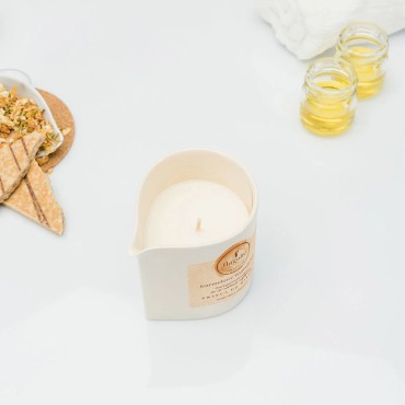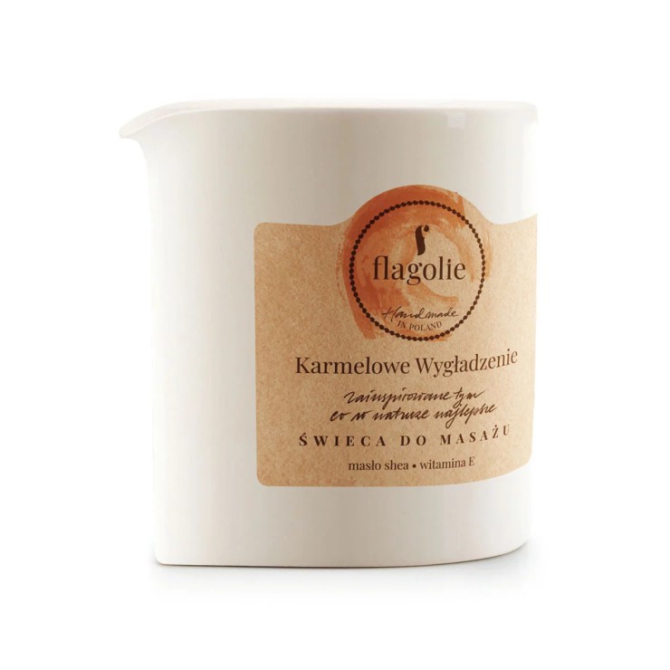 Naturalna świeca do masażu Karmelowe Wygładzenie Flagolie. Wykonana z naturalnych składniki, takich jak takie jak masło shea i wosk pszczeli. Dodatkowo, aby jeszcze bardziej zwiększyć przyjemność masażu, dodaliśmy do niej słodką kompozycję zapachową jaśminu i karmelu. Świeca Wylana w specjalnie wyprofilowanym i delikatnie połyskującym kremowym naczyniu ceramicznym, zapakowana w ozdobny karton z tektury ekologicznej.