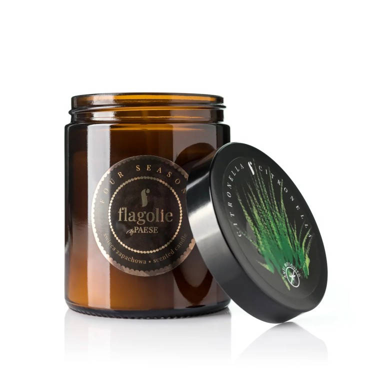 Naturalna świeca sojowa Citronella - Four Seasons Flagolie. Świeca do wnętrz o zapachu citronelli, wykonana z naturalnego wosku sojowego. Przywołuje na myśl ciepłe promienie słońca, a także skutecznie odstrasza komary i inne owady. Wylana w szklanym, brązowym słoiku.