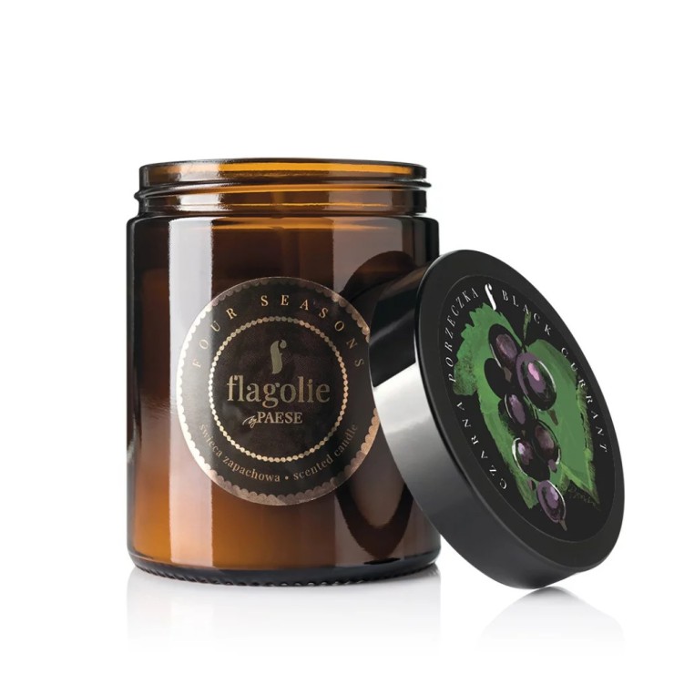 Naturalna świeca sojowa Czarna porzeczka - Four Seasons Flagolie. Świeca do wnętrz o zapachu Czarnej Porzeczki, wykonana ręcznie z naturalnego wosku sojowego wolnego od GMO, pestycydów i sztucznych dodatków. Wylana w szklanym, brązowym, zakręcanym pojemniku. Orzeźwiająca owocowa nuta czarnej porzeczki wyczuwalna jest jeszcze przed rozpaleniem świecy, zaraz po jej otworzeniu.