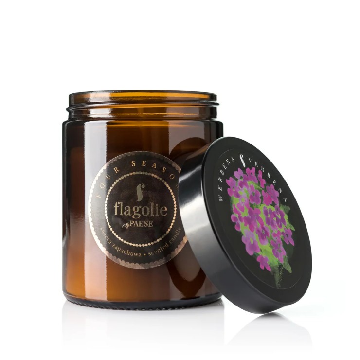 Naturalna świeca sojowa Werbena - Four Seasons Flagolie. Świeca do wnętrz o zapachu werbeny, wykonana z naturalnego wosku sojowego.Przywołuje na myśl kwitnące łąki. Odpręża i działa kojąco na zmysły. Wylana w szklanym, brązowym słoiku.