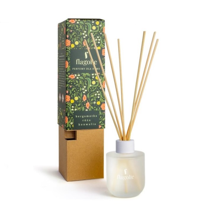 Perfumy dla domu- Dyfuzor Bergamotka, Róża, Konwalia Flagolie. Perfumy do wnętrz w formie pachnących patyczków. Dyfuzor zawiera starannie dobraną substancję zapachową, która dzięki patyczkom rattanowym przedostaje się do powietrza. Pomieszczenie wypełnia się przyjemnym aromatem, który utrzymuje się przez długi czas. Perfumy dla domu bergamotka, róża, konwalia to delikatny kwiatowy zapach ze szlachetną cytrynową, świeżą nutą.
